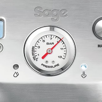 صفحه نمایش اسپرسوساز سیج SES920 و LCD بصری و فشارسنج برای کنترل دقیق تمام اطلاعات مورد نیاز برای ارائه اسپرسو کامل را نمایش می دهد.