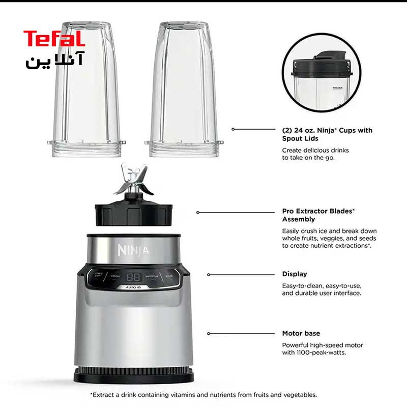 مخلوطکن مدل BN401 نینجا Ninja 64 اونس Precision Processor® Bowl پردازش دقیقی را برای خرد کردن یکنواخت، پورههای صاف و حداکثر 2 پوند فراهم می کند. 5 برنامه از پیش تعیین شده Auto-iQ® به شما امکان می دهد اسموتی، نوشیدنی های یخ زده، استخراج مواد مغذی، مخلوط های خرد شده و خمیر را با فشار یک دکمه ایجاد کنید. نوشیدنی حاوی ویتامین ها و مواد مغذی را از میوه ها و سبزیجات استخراج کنید.